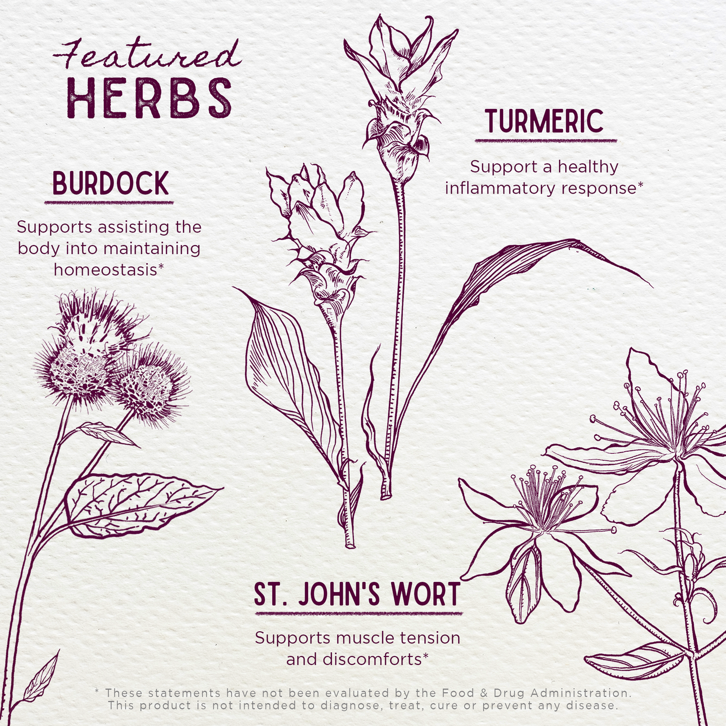 - Black Cohosh root: Actaea racemosa is used to support a healthy inflammatory response and calm and relax the muscles throughout the body and joints.