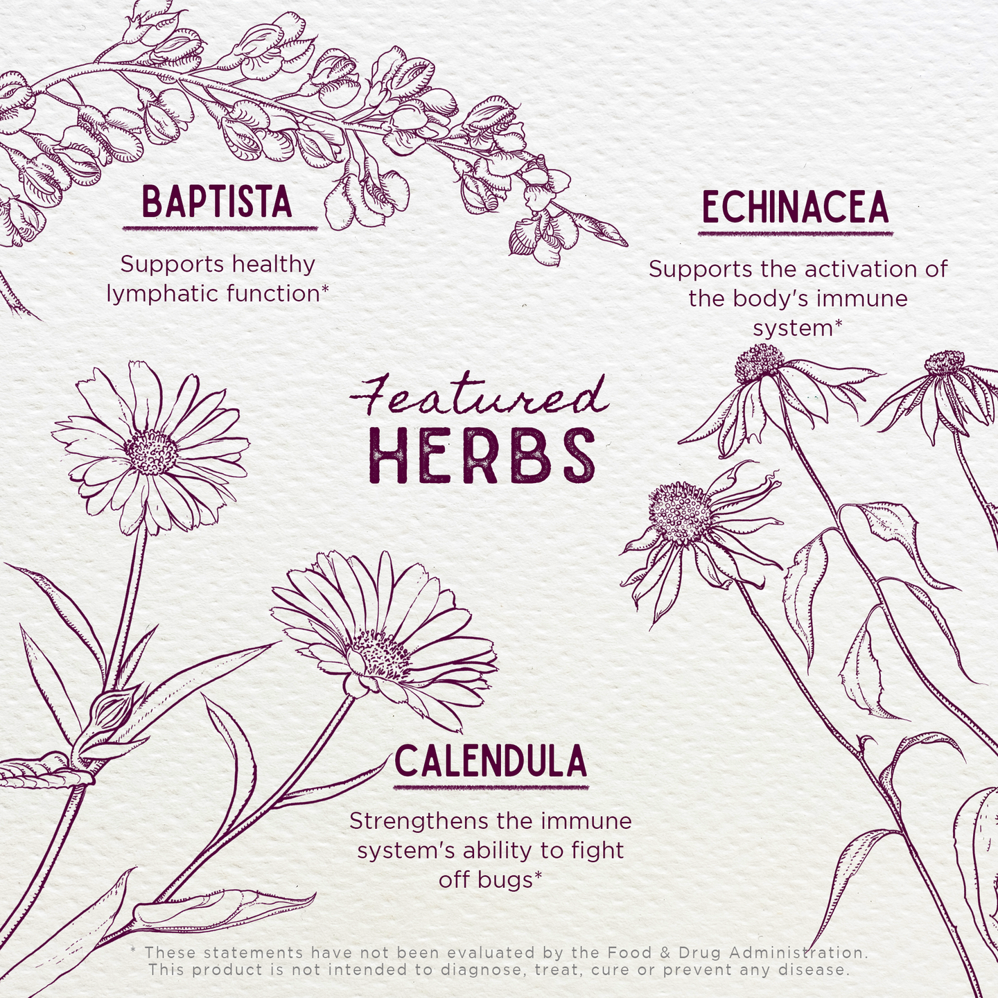 - Baptisia root: Baptisia tinctoria, also known as Wild Indigo, is native to the Northeastern United States and supports healthy lymphatic function, carrying immune properties into the nooks and crannies of the head.