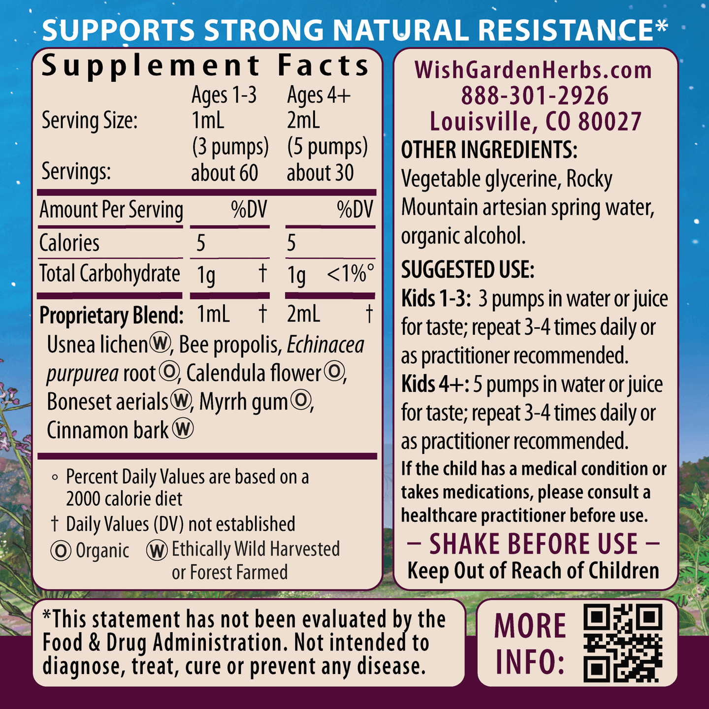 Usnea lichen (Usnea spp.), Bee Propolis, organic Echinacea purpurea root (Echinacea purpurea), organic Calendula flower (Calendula officinalis), Boneset aerials (Eupatorium perfoliatum), organic Myrrh gum (Commiphora molmol, C. myrrha), Cinnamon bark (Cinnamomum bumanii, C. cassia), vegetable glycerine, Rocky Mountain artesian spring water, & organic gluten-free alcohol.