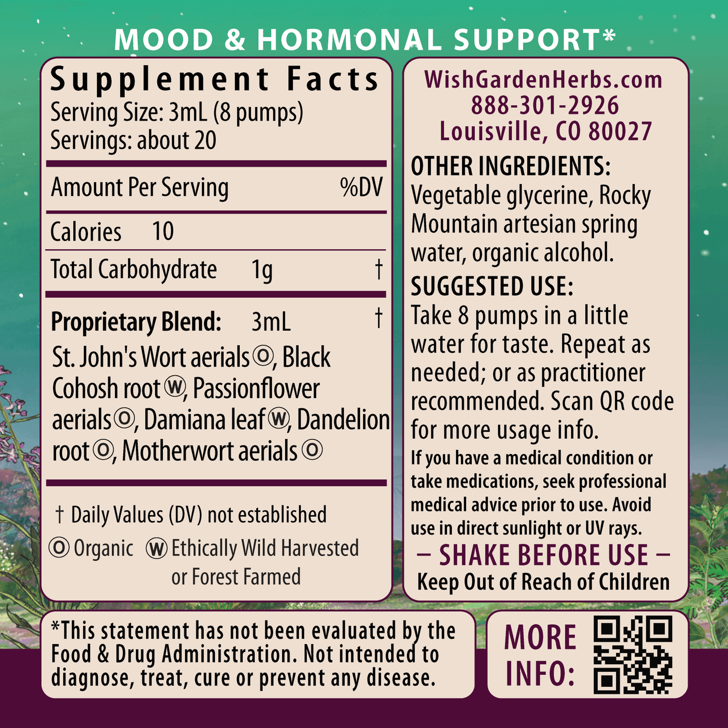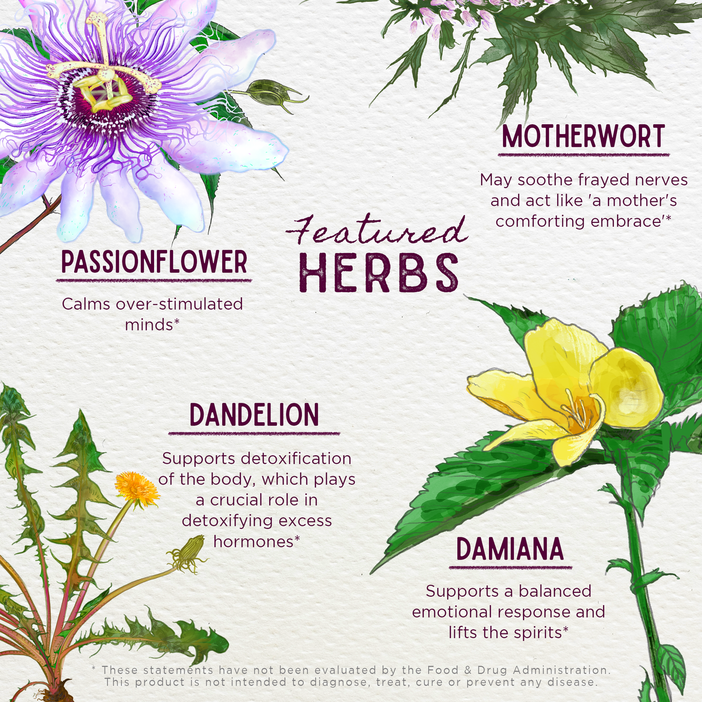 Organic St. John's Wort aerials (Hypericum perforatum), Black Cohosh root (Actaea racemosa (syn. Cimicifuga racemosa)), organic Passionflower aerials (Passiflora incarnata), Damiana leaf (Turnera diffusa, T. aphrodisiaca), organic Dandelion root (Taraxacum officinale), organic Motherwort aerials (Leonurus cardiaca), vegetable glycerine, Rocky Mountain artesian spring water, & organic gluten-free alcohol.