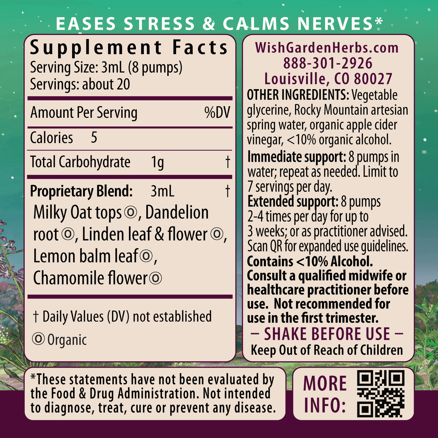 Organic Milky Oat tops (Avena sativa), organic Dandelion root (Taraxacum officinale), organic Linden leaf and flower (Tilia europea, T. cordata, T. spp.), organic Lemon Balm leaf (Melissa officinalis), organic Chamomile flower (Matricaria recutita, M. chamomilla), vegetable glycerine, Rocky Mountain artesian spring water, organic apple cider vinegar & organic gluten-free alcohol.