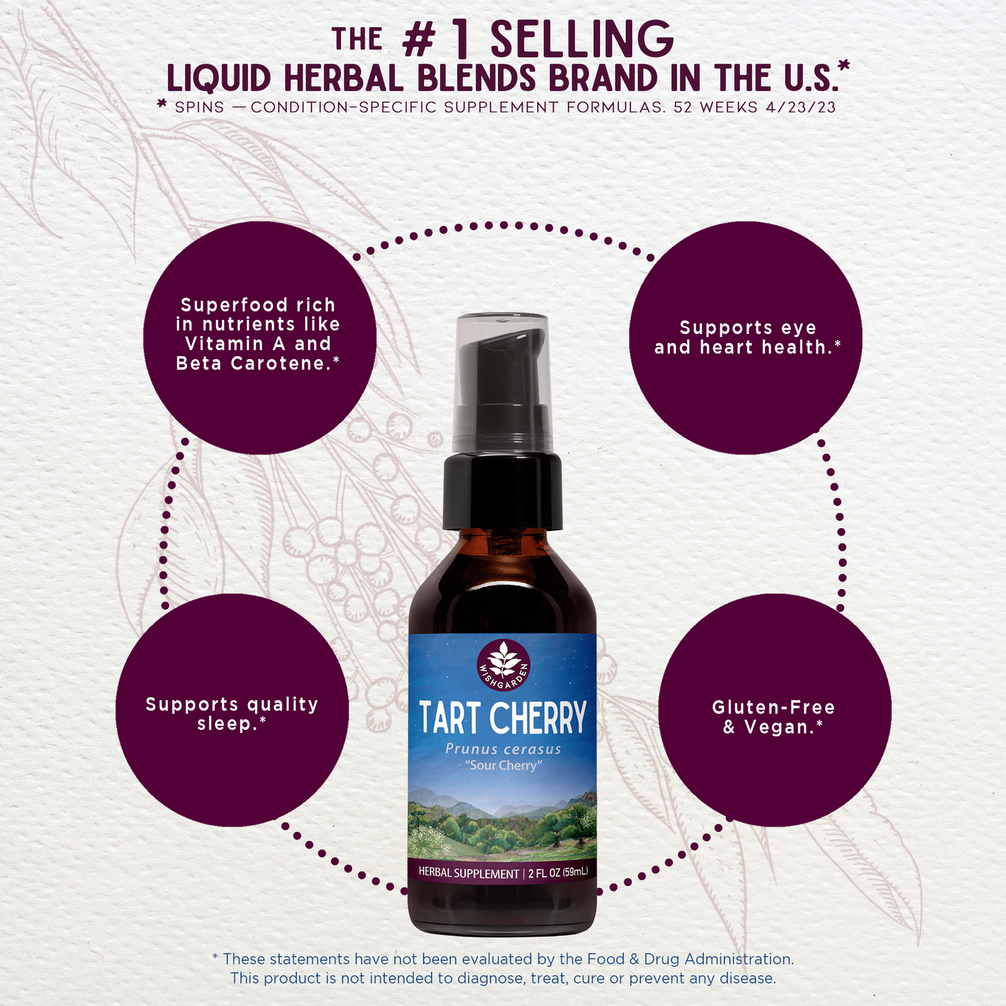 Organic Tart Cherry fruit (Prunus cerasus), Rocky Mountain artesian spring water, organic gluten-free alcohol & vegetable glycerine.